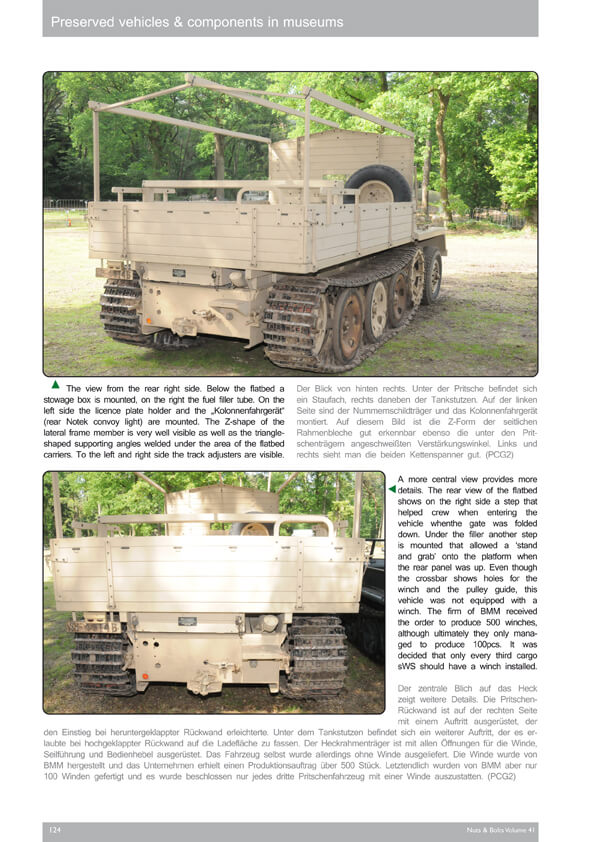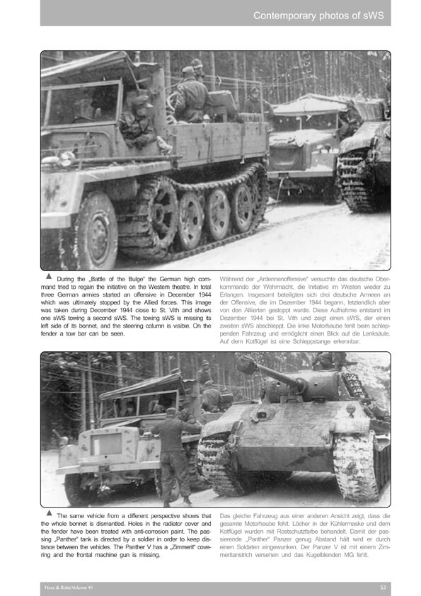 180 pages A4, glue-bound, approx. 268 photos, of these 91 contemporary photos from manuals, combat and war fronts in b/w, most of them previously unpublished; 119 colour photos of restored vehicles and their components in public and private collections, 58 colour photos of the four models from T.Greenland & V.Branigan, English / German captions, 40 pages English / German text with 25 tables, 35 pages of scale drawings of all versions and details in 1:35 scale from Lieven De Coninck, 18 camouflage schemes from Laurent Lecoq with tactical and units signs and 3 tables of organization of units (Kriegstärke-Nachweisungen KStN) having these vehicles in their arsenal, first published November 27th, 2018