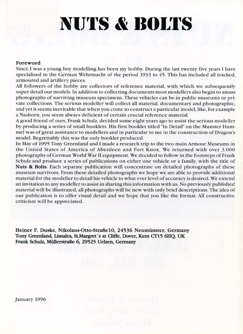 36 pages A4, 97 b/w photos of the surviving vehicles of the Aberdeen Proving Ground collection USA, Bovington Tank Museum UK, Kubinka Tank Museum Russia, English/German text and photo captions, first published March 20th, 1996, (out of print)