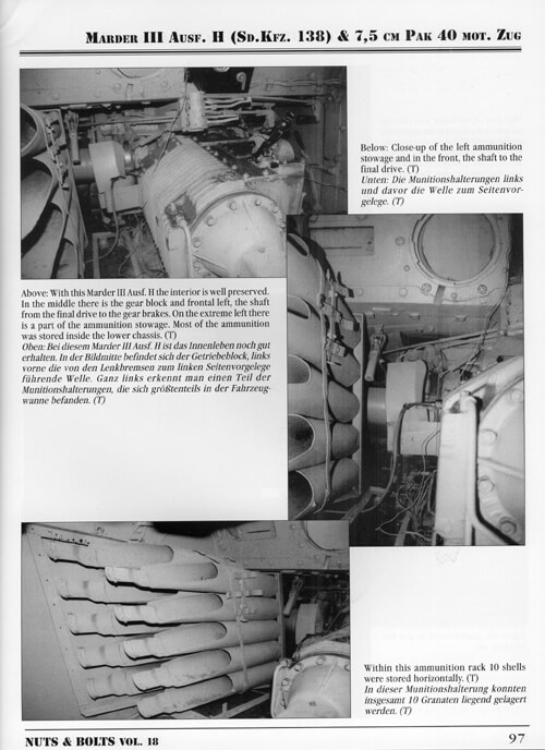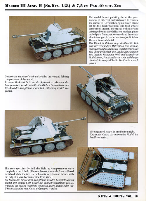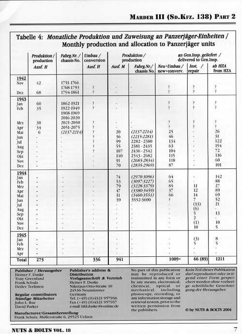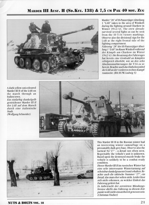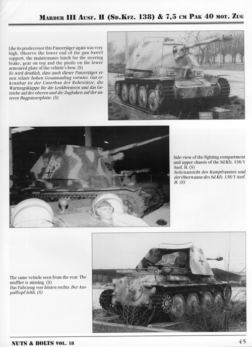 128 Seiten A4, Klebebindung, ca. 366 Fotos, davon 142 Marder III Ausf. H & 7,5cm Pak 40 historische Fotos von 1942 -1945 in s/w, die meisten davon unveröffentlicht, 224 s/w Fotos von verschiedenen Fahrzeugen und Geschützen in verschiedenen Sammlungen, 10 Farbfotos des umgebauten Italeri Modells von Tony Greenland, Englisch / Deutsche Bildunterschriften, 26 Seiten Englisch / Deutscher Text, 5 Seiten Maßstabszeichnungen und 3D-Ansichten aller Varianten in 1:35 von John Rue, 3 Seiten in Farbe mit verschiedenen Tarnschemen von David Parker, erstmals erschienen am 20. Mai 2004