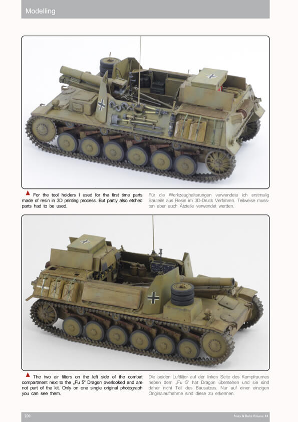 204 Seiten A4, Leimbindung, ca. 275 Fotos, davon 199 historische Fotos aus Vorschriften und Einsätzen in s/w, z.T. erstmalig veröffentlicht; 142 Farbfotos der noch existierenden FAMOs in Museen und privaten Sammlungen, 41 Farbfotos der von Tony Greenland, Vinnie Branigan und drei weiteren Modellbauern gebauten Modelle, deutsch / englische Bildunterschriften, 64 Seiten deutsch / englischer Text, 37 Tabellen, 41 Seiten Maßstabszeichnungen aller Versionen incl. Sd.Ah. 116 im Maßstab 1:35 von Lieven DeConinck, 12 Farbtafeln mit verschiedenen Tarnschemen von Laurent Lecocq incl. Markierungen und 4 Kriegsstärke-Nachweisungen KStN der mit diesen Fahrzeugen ausgerüsteten Einheiten, zuerst veröffentlicht 23. November 2020